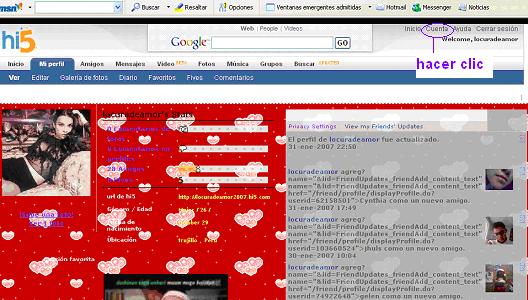 1º Debes en la parte derecha superior de tu hi5 hacer clic en “Cuenta”.